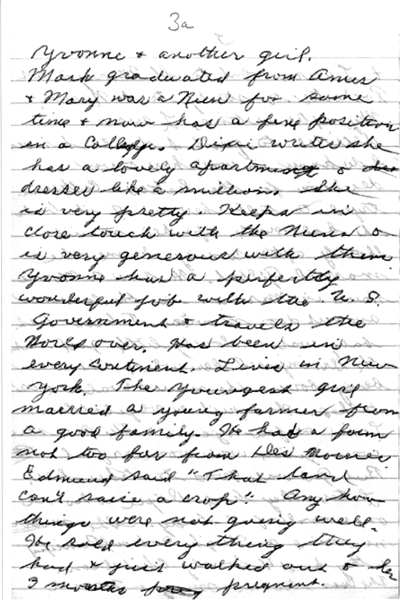 Mark graduated from Ames & Mary was a Nun for some time & now has a fine position in a College. Dixie writes she has a lovely apartment & she dresses like a million. She is very pretty. Keeps in close touch with the Nuns & is very generous with them. Yvonne has a perfectly wonderful job with the U.S. Government & travels the World over. Has been in every continent. Lives in New York. The youngest girl married a young farmer from a good family. He had a farm not too far from Des Moines. Edmund said "That land can't raise a crop." Anyhow things were not going well. He sold everything they had & just walked out & her 3 months pregnant. I forgot to say that after the children were grown Dixie had divorced their father. Why I was never told & didn't feel it was my business to ask.