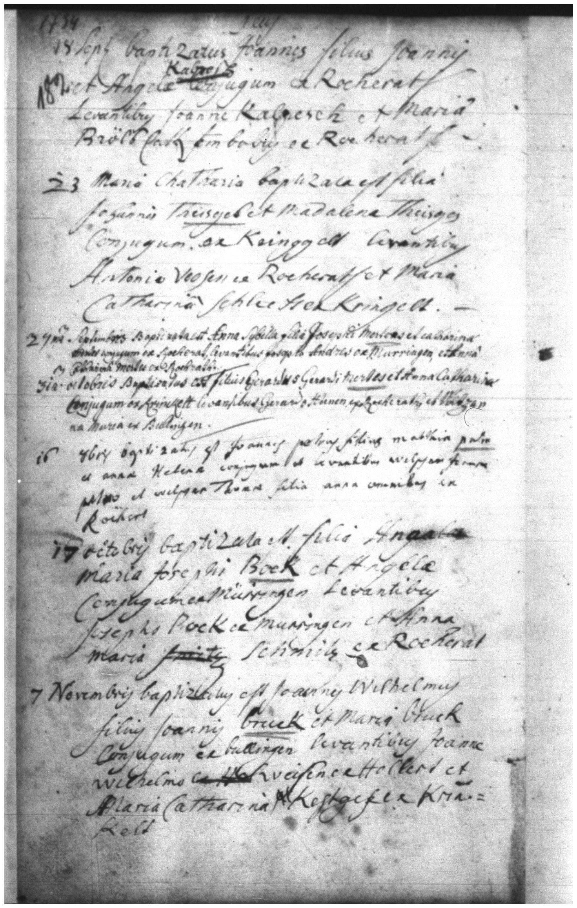 7 Novembris baptizatus est Joannes Wilhelmus filius Joannis brück et Maria bruck conjugum ex bullingen levantibus Joanne Wilhelmis weisence Hollers et Maria Catharina Kestgeser Krinkeld.
