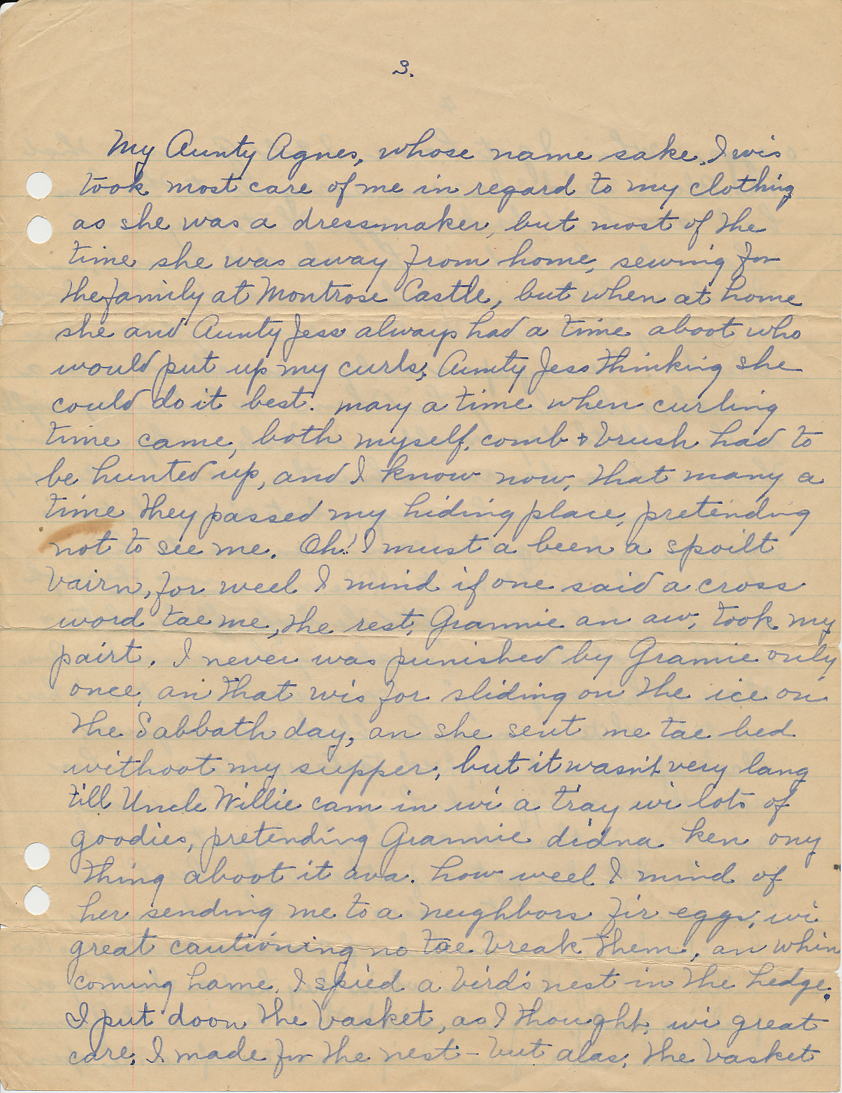 My Aunty Agnes, whose namesake I wis, took most care of me in regard to my clothing as she was a dressmaker, but most of the time she was away from home, sewing for the family at Montrose Castle, but when at home she and Aunty Jess always had a time aboot who would put up my curls, Aunty Jess thinking she could do it best. Many a time when curling time came, both myself, comb & brush had to be hunted up, and I know now, that many a time they passed my hiding place, pretending not to see me. Oh! I must a been a spoilt bairn, for weel I mind if one said a cross word tae me, the rest, Grannie an aw, took my pairt. I never was punished by Grannie only once, and that wis for sliding on the ice on the Sabbath day, an she sent me tae bed withoot my supper; but it wasn't very lang till Uncle Willie cam in wi a tray wi lots of goodies, pretending Grannie didna ken ony thing aboot it ava. How weel I mind of her sending me to a neighbors fir eggs, wi great cautioning no tae break them, an whin coming hame, I spied a bird's nest in the hedge I put doon the basket, as I thought wi great care. I made fir the nest-but alas, the basket 'o eggs whin I got hame, I told Grannie that Mrs. Blair said she was sorry but the hens had awe laid broken eggs that day. And when she looked in, hoo she did lauch, an I've been telt since, she lauches & telt aboot it, many times, an the tears rinning-doon her cheeks. Newspapers only came aboot once a month & she always hid them on Saturday nights so the Sabbath day wouldna be broken by reading them, and we daurna whistle even, on a Sunday.