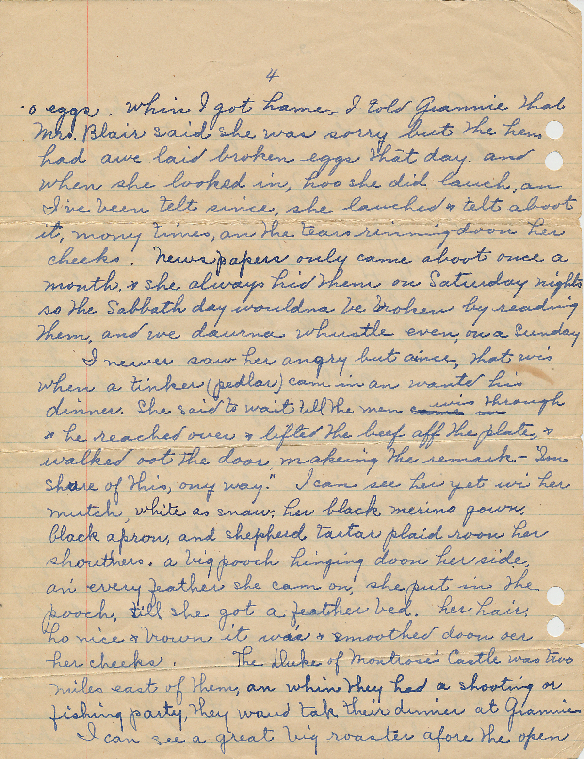 I never saw her angry, but aince, that wis when a tinker (pedlar) cam in an wanted his dinner. She said to wait till the men wis through & he reached over & lifted the beef aff the plate, & walked oot the door making the remark-I'm shure of this, ony way." I can see her yet wi her mutch, white as snaw. Her black merino gown, black apron, and shepherd tartar plaid roon her shouthers. A big pooch hinging doon her side, an every feather she cam on, she put in the pooch, till she got a feather bed. Her hair, ho nice & brown it wis & smoothed doon oer her cheeks. The Duke of Montrose's Castle was two miles east of them, an whin they had a shooting or fishing party, they waud tak their dinner at Grannies.